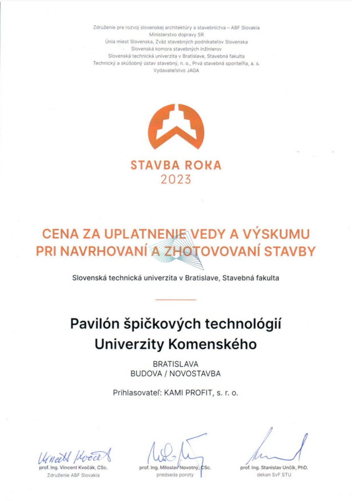 A Komenský Egyetem csúcstechnológiai pavilonja 2023-as Év Épülete