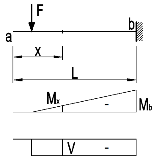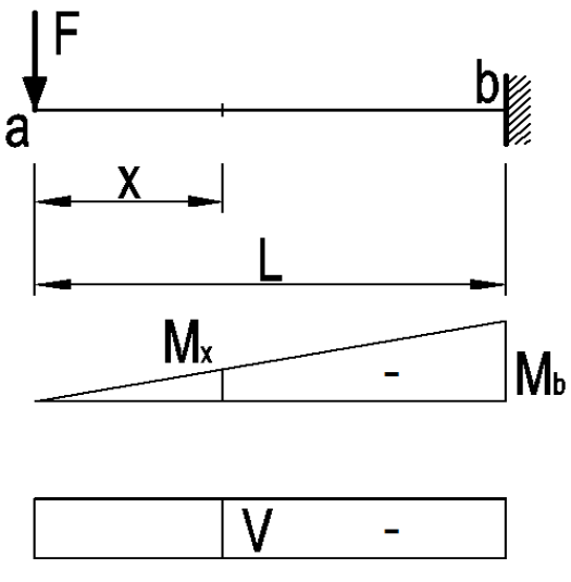 Vysvetlivky: F – bodové zaťaženie; L – dĺžka nosníka; x – vzdialenosť od kraja konzoly; I – moment zotrvačnosti; E – modul pružnosti materiálu nosníka; Rb – reakcia v podpere; Vb – posúvajúca sila; Mb – maximálny ohybový moment; Mx – ohybový moment vo vzdialenosti x; va – maximálny priehyb na konci konzoly
