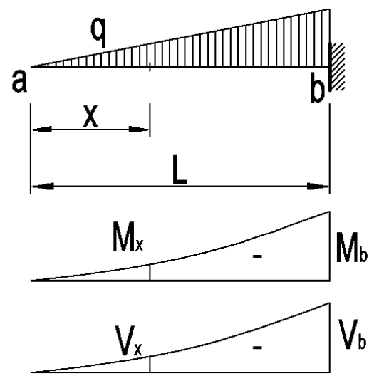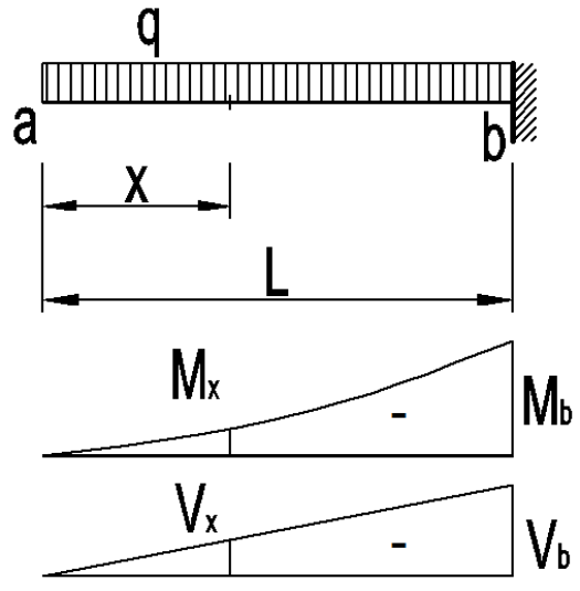 Vysvetlivky: q – maximálne líniové zaťaženie; L – dĺžka nosníka; x – vzdialenosť od kraja konzoly; I – moment zotrvačnosti; E – modul pružnosti materiálu nosníka; Rb – reakcia v podpere; Vb – posúvajúca sila; Mb – maximálny ohybový moment; Mx – ohybový moment vo vzdialenosti x; va – maximálny priehyb na konci konzoly