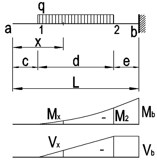 Vysvetlivky: q – líniové zaťaženie; L – dĺžka nosníka; c – vzdialenosť začiatku zaťaženia od konca konzoly; d – dĺžka zaťaženia; x – vzdialenosť od kraja konzoly; e – vzdialenosť nezaťaženej časti; I – moment zotrvačnosti; E – modul pružnosti materiálu nosníka; Rb – reakcia v podpere; Vb – posúvajúca sila; Mb – maximálny ohybový moment; Mx – ohybový moment vo vzdialenosti x; M2 – ohybový moment v bode 2; va – maximálny priehyb na konci konzoly