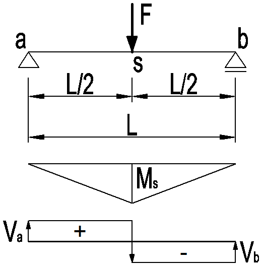 Vysvetlivky: F – bodové zaťaženie; L – dĺžka nosníka; I – moment zotrvačnosti; E – modul pružnosti materiálu nosníka; Ra a Rb – reakcie podpier; Va a Vb – posúvajúce sily; Ms – ohybový moment; vs – priehyb v strede dĺžky nosníka; φa a φb – pootočenie prúta pri podpere