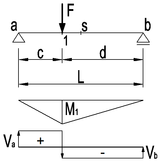 Vysvetlivky: F – bodové zaťaženie; L – dĺžka nosníka; c – poloha bodového zaťaženia od podpery a; d – poloha bodového zaťaženia od podpery b; I – moment zotrvačnosti; E – modul pružnosti materiálu nosníka; Ra a Rb – reakcie podpier; Va a Vb – posúvajúce sily; M1 – ohybový moment v mieste pôsobenia zaťaženia; vs – priehyb v strede dĺžky nosníka; v1 – priehyb v mieste pôsobenia zaťaženia; φa a φb – pootočenie prúta pri podpere