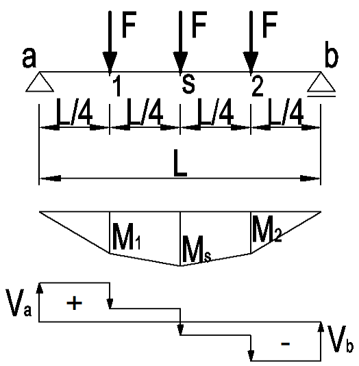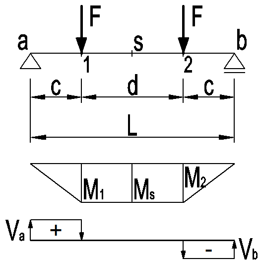 Vysvetlivky: F – bodové zaťaženie; L – dĺžka nosníka; c – poloha bodového zaťaženia od podpery; d – vzdialenosť medzi dvomi bodovými zaťaženiami; I – moment zotrvačnosti; E – modul pružnosti materiálu nosníka; Ra a Rb – reakcie podpier; Va a Vb – posúvajúce sily; M1 a M2 a Ms – ohybový moment; vs – priehyb v strede dĺžky nosníka; φa a φb – pootočenie prúta pri podpere