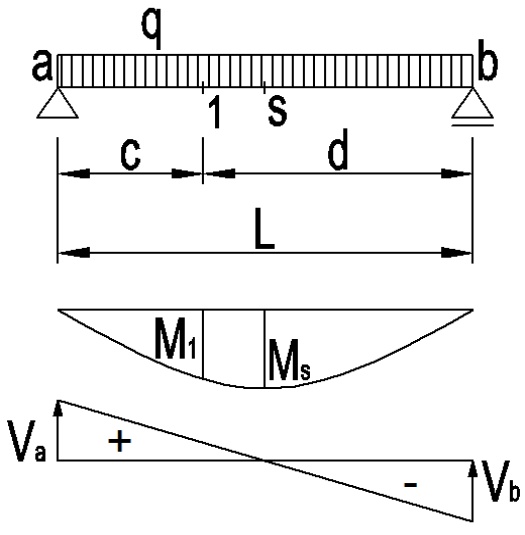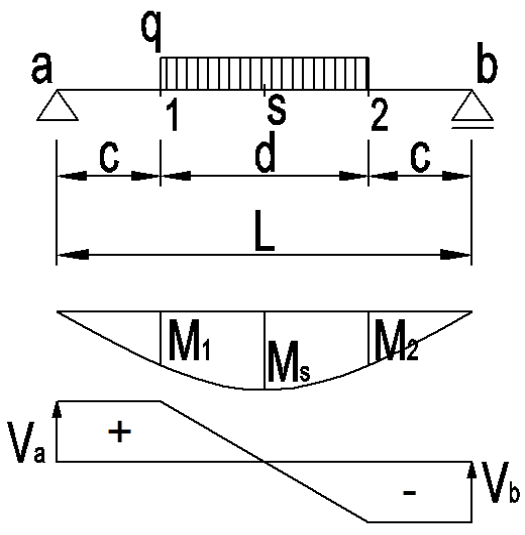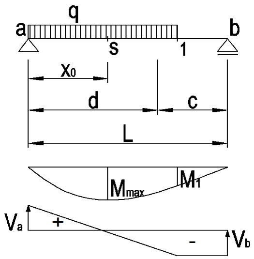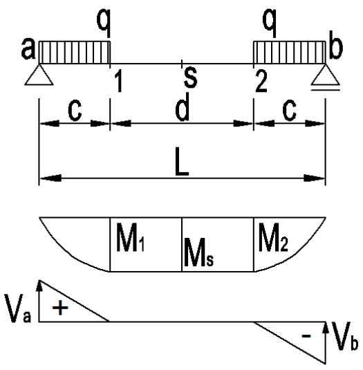 Vysvetlivky: q – líniové zaťaženie; L – dĺžka nosníka; c – dĺžka zaťaženia od podpery a; d – nezaťažená časť nosníka; I – moment zotrvačnosti; E – modul pružnosti materiálu nosníka; Ra a Rb – reakcie podpier; Va a Vb – posúvajúce sily; M1 a Ms – ohybový moment; x0 – poloha maximálneho momentu; φa a φb – pootočenie prúta pri podpere